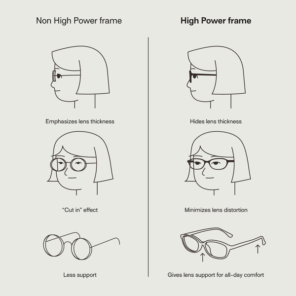 Designed for high prescriptions, High Power frames minimize distortion and hide lens thickness for a more balanced look. Best for grades -3.00 and up.