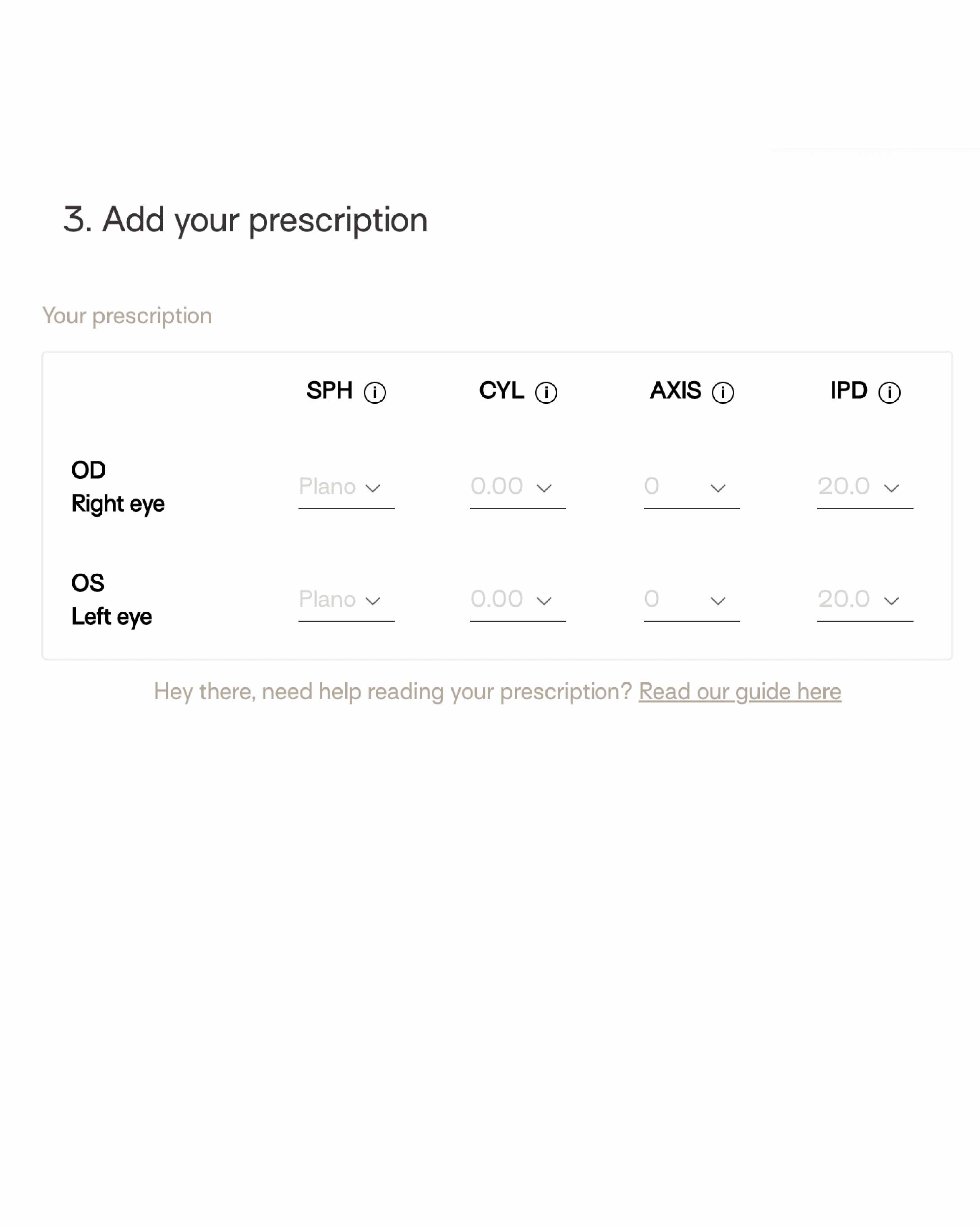 Add your prescriptionGrab a copy of your prescription and fill in the spaces provided. If you’ve shopped with us before, access your prescription with your email address.