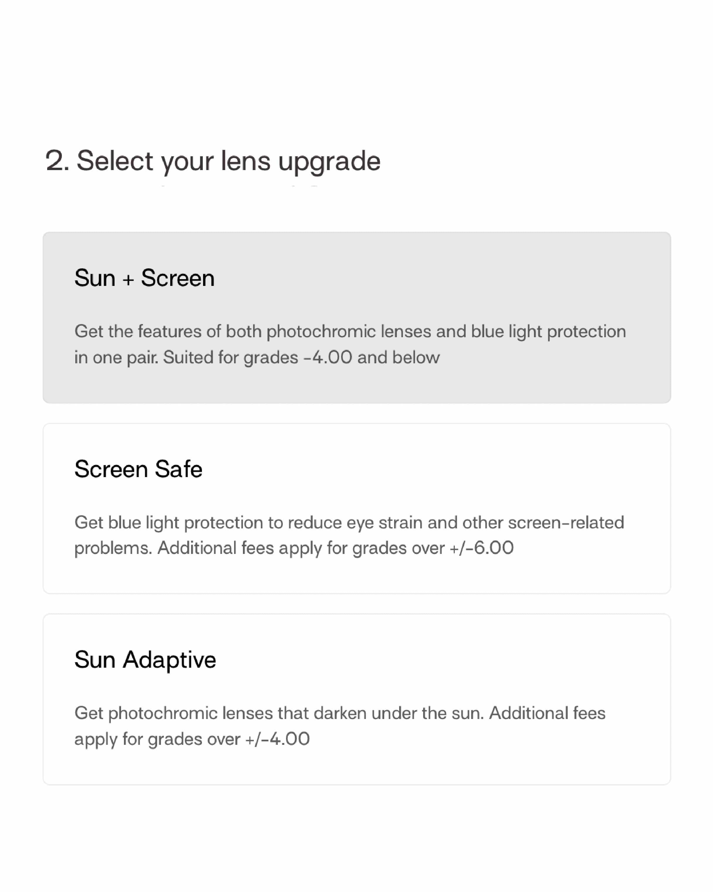 Select lens upgradeChoose “Sun + Screen” from our selection of lens upgrades.
