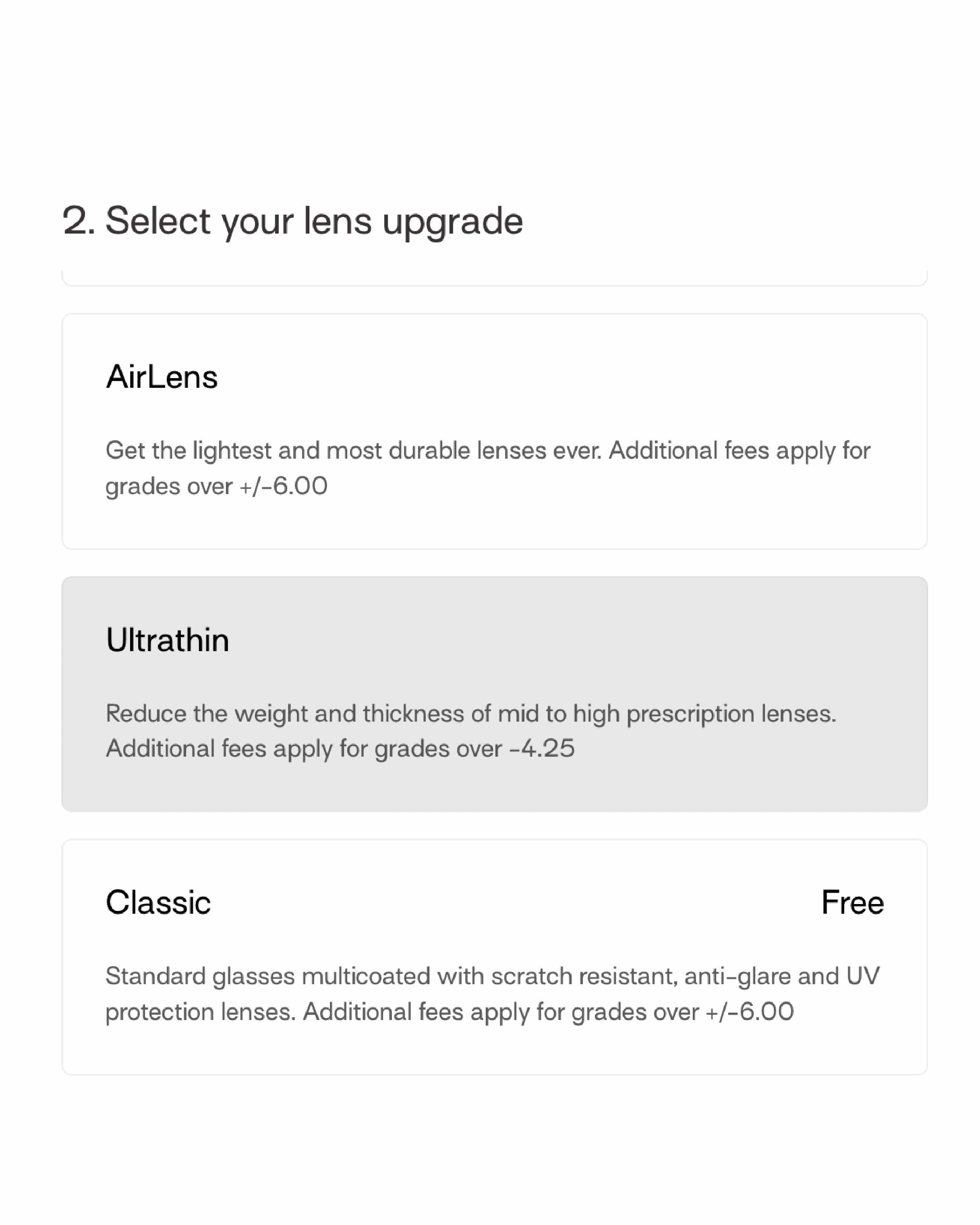 Select lens upgradeChoose “Ultrathin” from our selection of lens upgrades.
