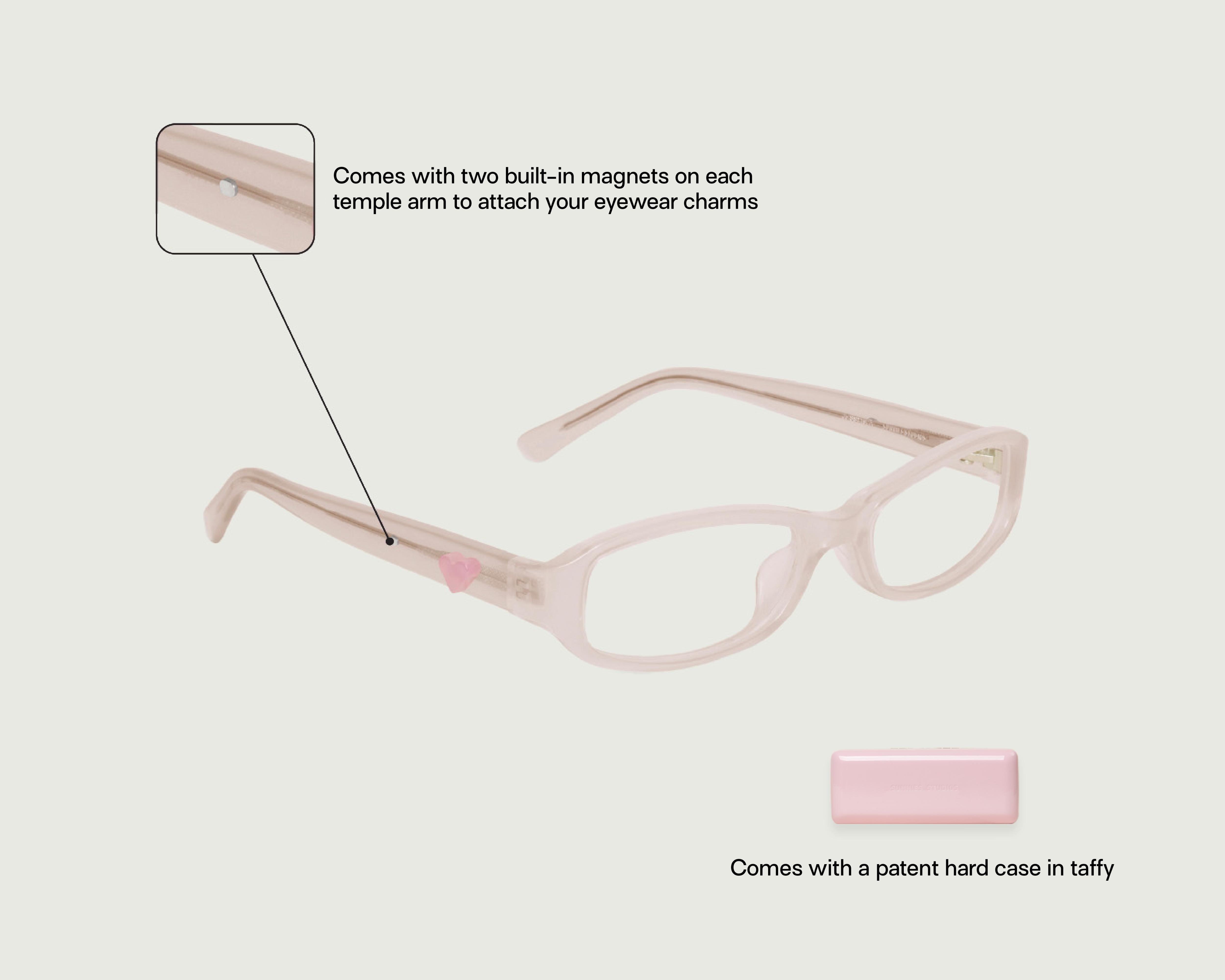 The temples arms are integrated with magnets to easily attach your eyewear charms — free with every purchase of Taffy frame with lens upgrade. Terms and conditions apply.