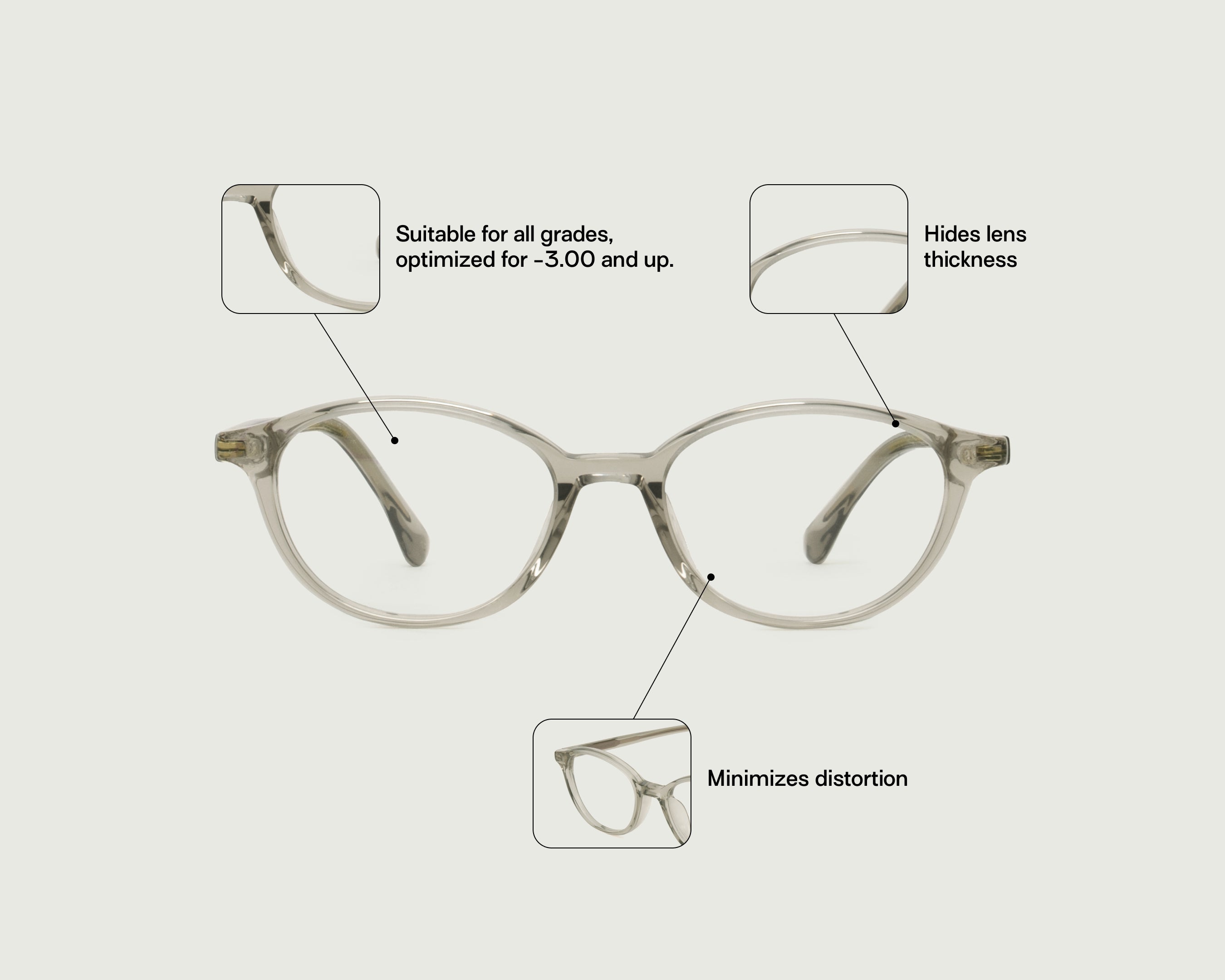 Reduce the weight and thickness of mid to high prescription lenses. Suited for grades from +8.00 to -10.00 and astigmatism (CYL) up to -4.00
